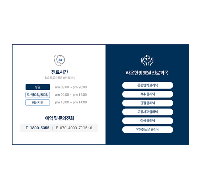 여러분의 인생병원,라온한방병원에서통증,면역치료 받아보세요. 자세히 보기 > 치료에 집중할 수 있도록 준비한 3가지! 양한방치료 시스템 내 집 같은 입원실 부담감 없는 진료비 인사말 우리 가족의 건강을 함께 합니다. 양한방치료의 조화, 내 집같은 입원실, 부담을 줄인 진료비! 라온한방병원에서 진료 받으세요~ 라온한방병원 홈페이지를 방문해주신 고객 여러분 진심으로 감사드립니다.라온한방병원은 현대의학적 치료법과 최신 한의학적 치료법을 도입한양방 한방 협진 시스템으로 다양한 난치성질환의 비수술 치료를 지향합니다.100세 시대를 도래하여, 뿌리부터 건강한 삶을 누리실 수 있도록 라온한방병원 모든 의료진이 최선을 다해 진료하도록 노력하겠습니다.병원장 이지훈 이젠 바쁜 일상에 쫓겨 통증을 참지 마세요. "365일" 연중무휴 공동 간병실 운영 수술 후 안정가료, 거동이 불편한 환자를 위해 공동 간병실을 운영하고 있습니다. 평일 야간진료 평일 매일 밤 8시까지 야간진료, 퇴근 후 진료 받으세요!여러분의 치료와 회복을 위해 최선을 다하겠습니다. 교통사고 후유증 허리통증 / 무릎통증 / 어지러움 두통/ 손발 및 전신 저림초기 치료를 놓친다면 일상생활에 지장을 주게 됩니다. 라온한방병원 진료 절차안내 1 접수 데스크에서 초진 접수증 작성 2 상담 담당자와 내원 및 사고경위 상담 3 진료 양 · 한방원장님과 진료 4 X-ray 촬영 불편한 부위 환복 및 엑스레이 촬영 5 X-ray 설명 촬영한 엑스레이 업로드 후 엑스레이 확인 및 설명안내 6 치료실 치료실로 이동 후 치료 7 수납 데스크에서 진료비 및 치료비 수납 문의하기